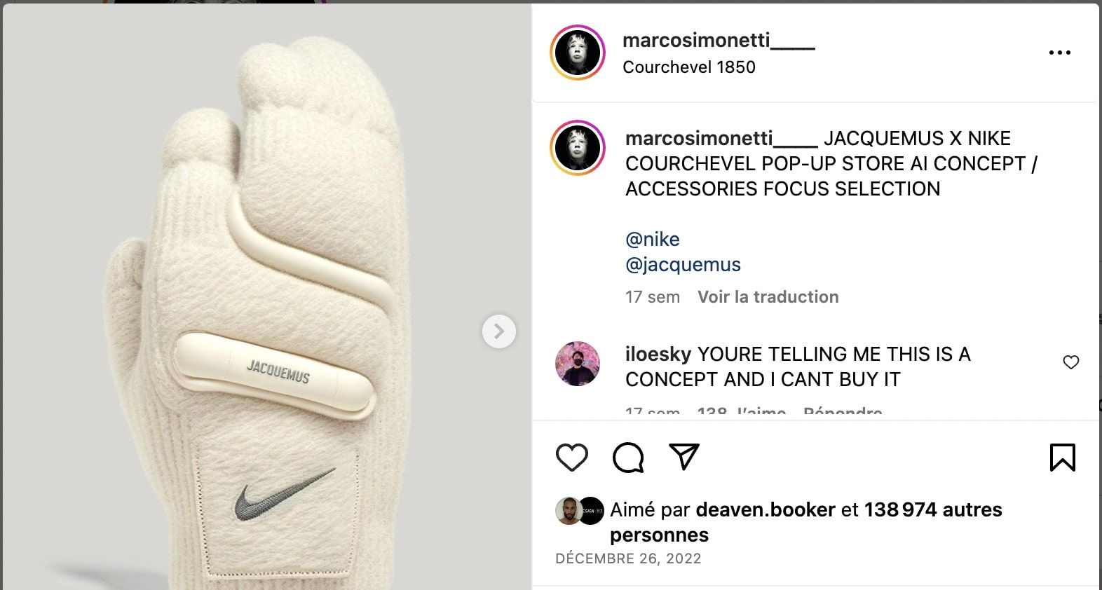💙 La best practice : Jacquemus x Nike. Cette collaboration imaginée sur des vêtements d'hiver est malheureusement non officielle, elle est pourtant le plus bel exemple d'une alliance imaginée avec brio entre deux grandes marques.