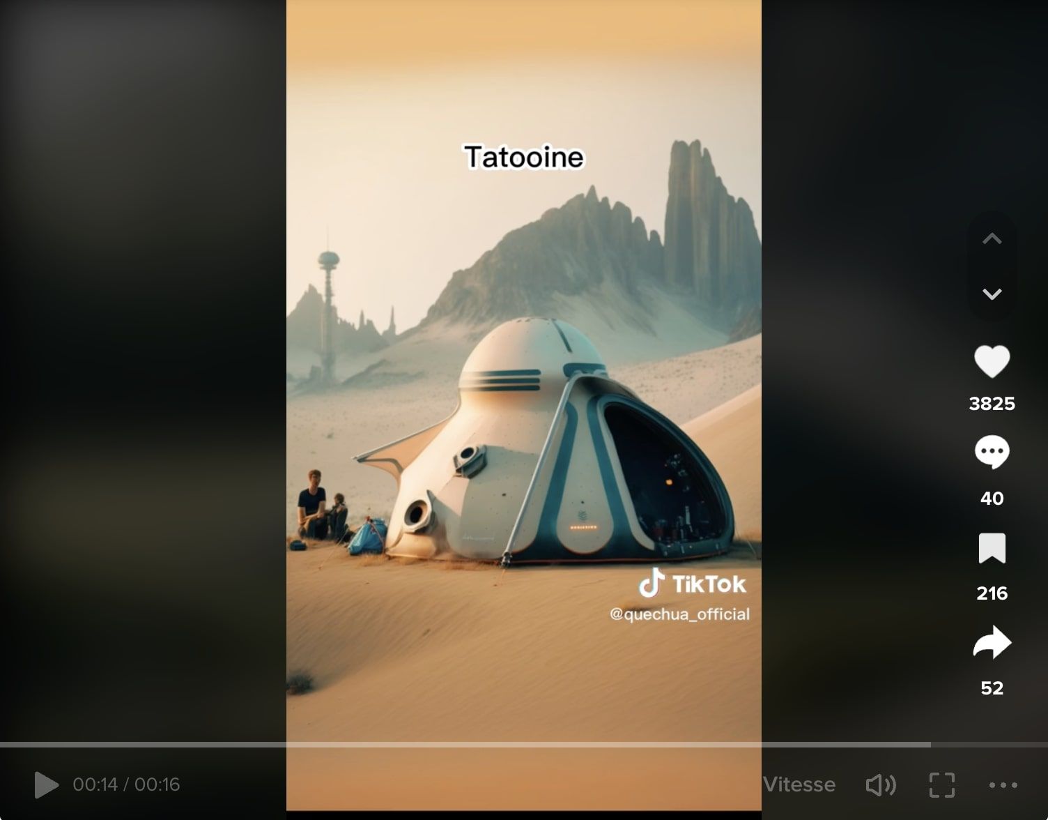 💙 La best practice : Quechua. La marque, très populaire sur TikTok, a mobilisé l'IA dans une publication vidéo pour représenter sa nouvelle tente sur les planètes de Star Wars… Et ses fans ont adoré.