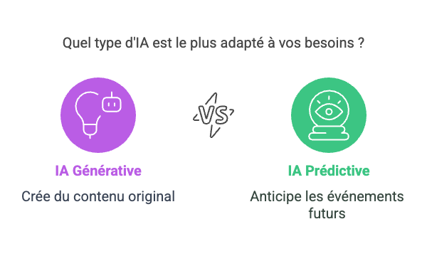 À l'inverse de l'IA générative, qui génère de nouvelles données à partir de celles existantes et peut créer du contenu original tel que des textes, des images, des musiques ou des vidéos, l'IA prédictive se concentre sur l'anticipation des événements à venir à travers l'analyse des données recueillies.