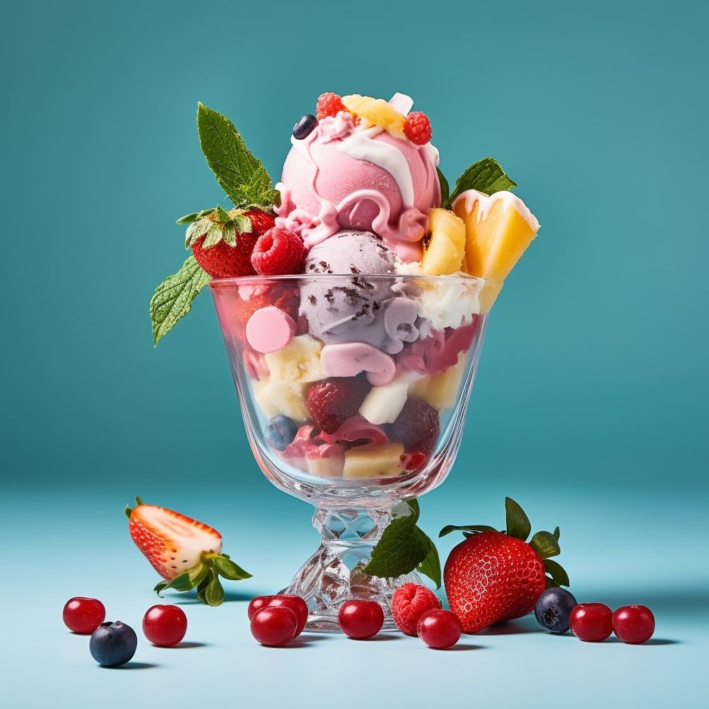 Exemple avec l'usage d'emojis assemblant glace, arc-en-ciel, fraise et fleurs. Midjourney va comprendre que je ne souhaite pas représenter une glace à côté d'un arc-en-ciel, mais bien une composition colorée.