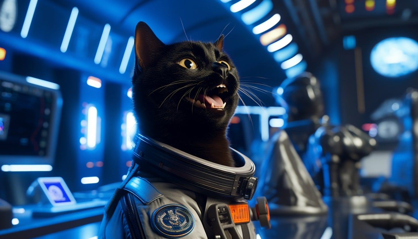 Portrait of a happy black astronaut cat, 😃, spaceship control room in the background, blurry background, fluorescent blue lighting, octane, intricately detailed, realistic textures, cinematic lighting, masterpiece