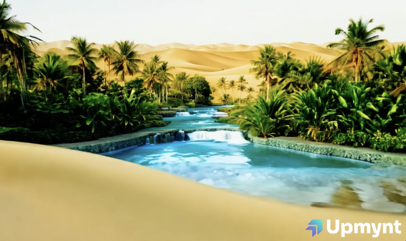 Desert landscape rapidly transforming into a lush oasis, sand dunes becoming green, turquoise water appearing, woah effect