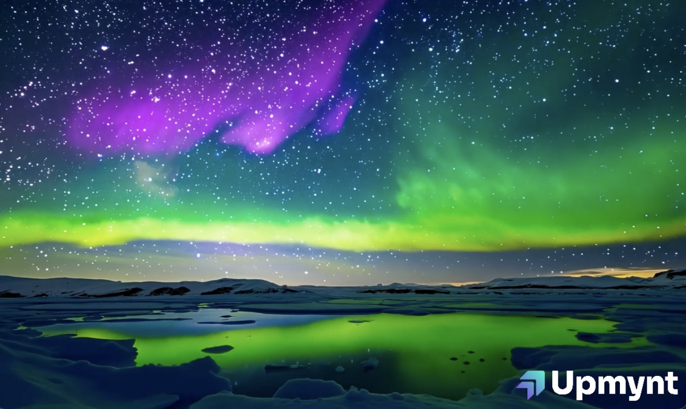 Northern lights dancing over an arctic landscape, shimmering colors, reflections on icy surface