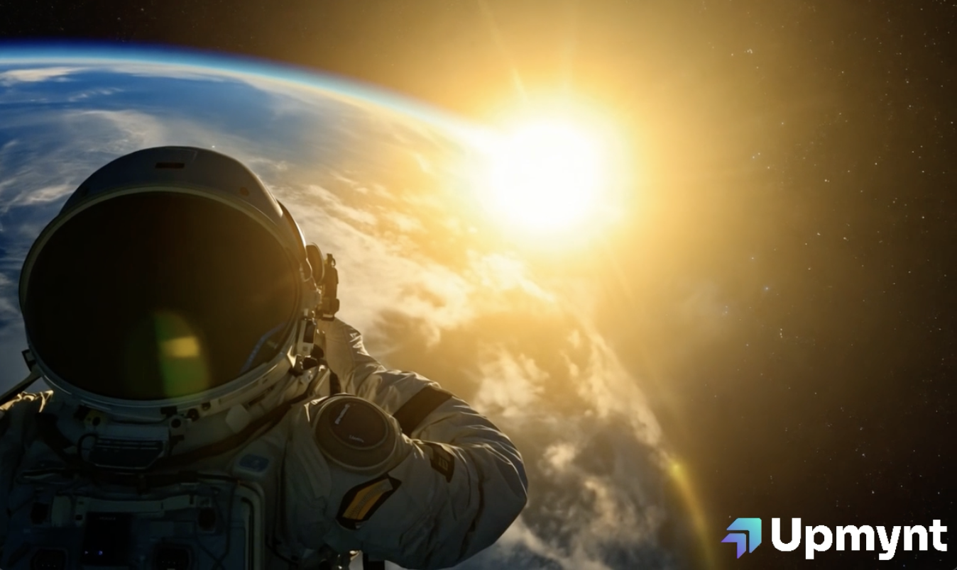 Astronaut slowly floating in space, Earth in background, sun peeking over the horizon, detailed spacesuit, cinematic