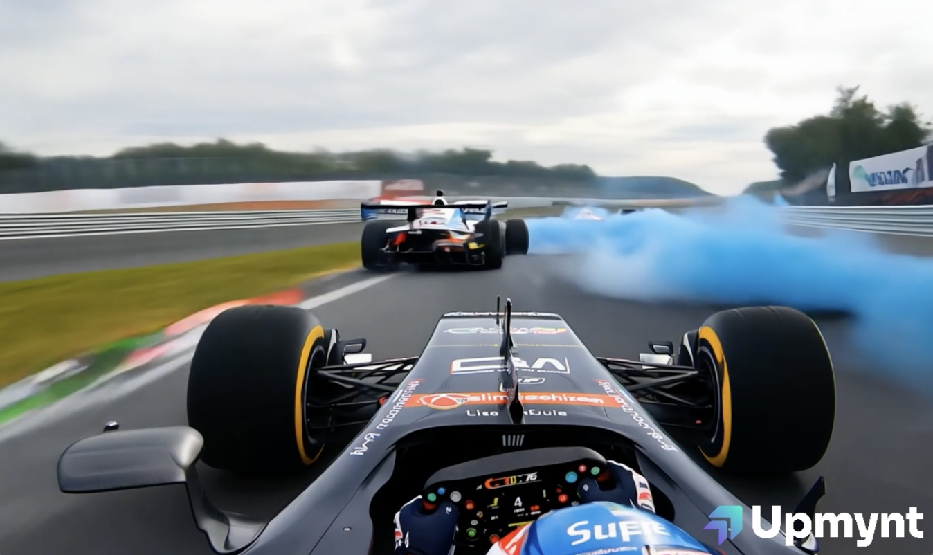 Formula 1 driver taking a tight corner, back view, sparks flying and smoke, motion blur
