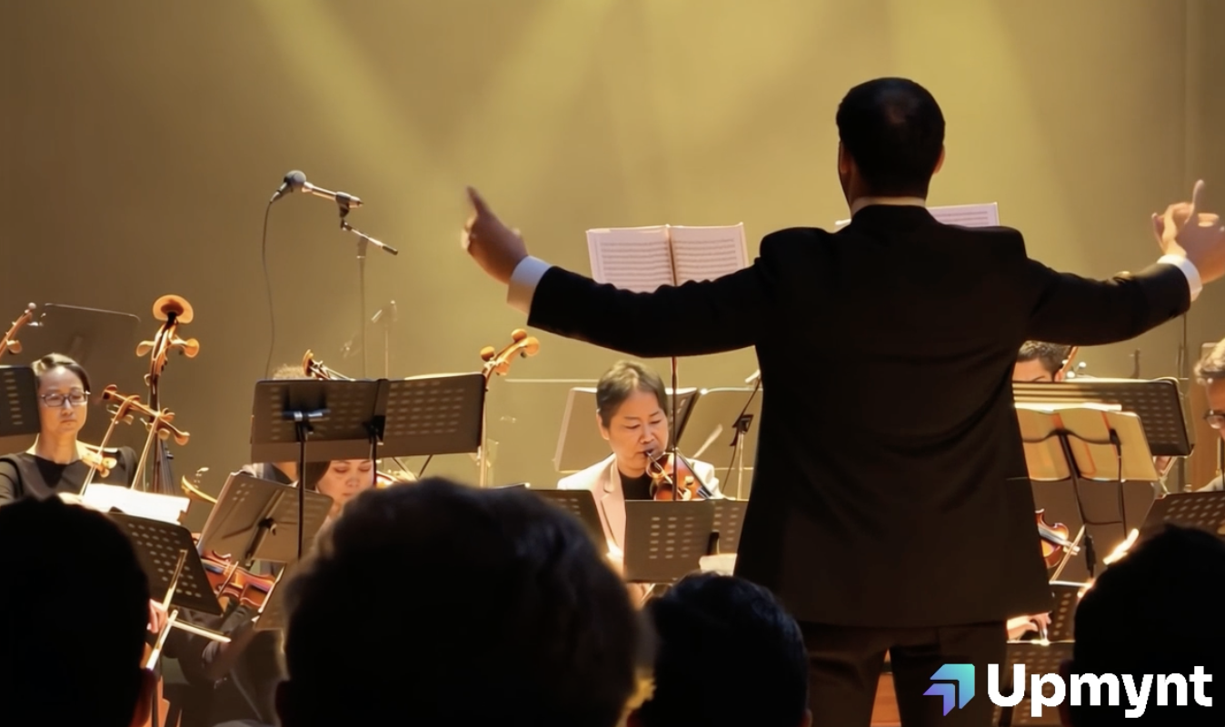 Orchestra conductor leading a passionate performance, filled concert hall, dynamic arm movements, soft light