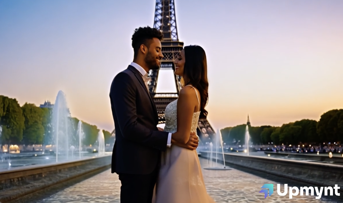Couple's first kiss in front of the sparkling Eiffel Tower at night, Trocadero fountains in foreground, romantic lighting, sunset, cinematic