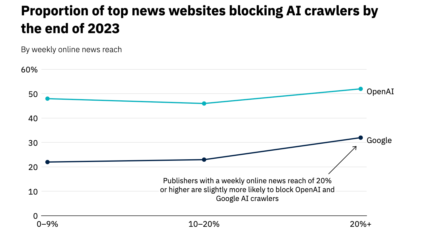 🌐 Les sites d'infos bloquent les crawlers IA, et ce, de plus en plus. Ainsi, les crawlers d'OpenAI (pour ChatGPT) et de Google (pour Gemini) sont respectivement bloqués par 52% et 32% des sites de news. (source)