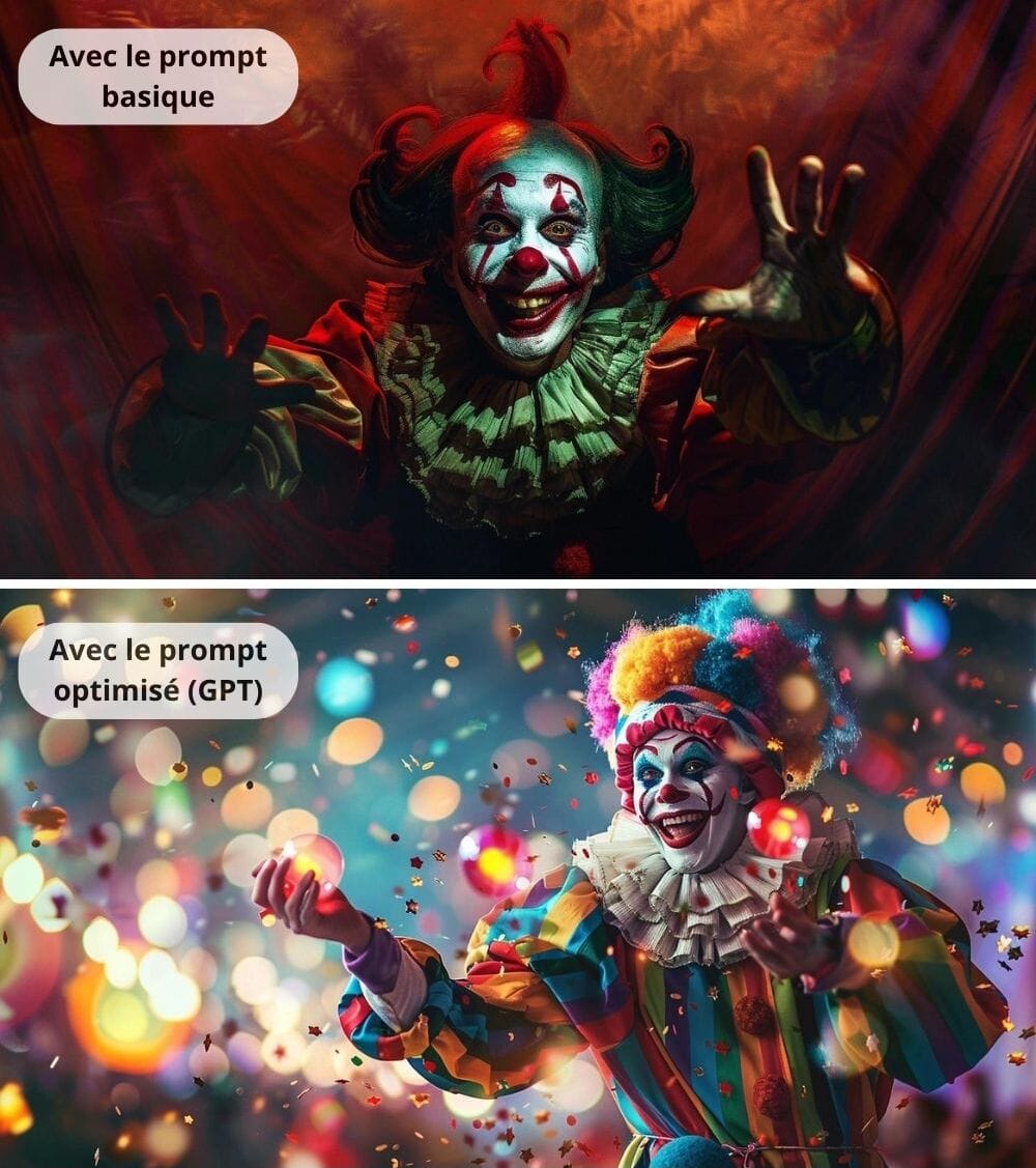 Voici le prompt pour un visuel que je souhaite générer sur Midjourney : [votre prompt basique]. Peux-tu l'améliorer pour ajouter des éléments et des précisions qui augmenteront l'impact visuel de l'image ainsi générée, et me proposer ainsi un nouveau prompt en anglais, avec une formulation droit au but, en évitant les phrases trop longues.Ainsi, en lui demandant d'améliorer le prompt basique "a clown in a circus", ChatGPT propose une version super enrichie :