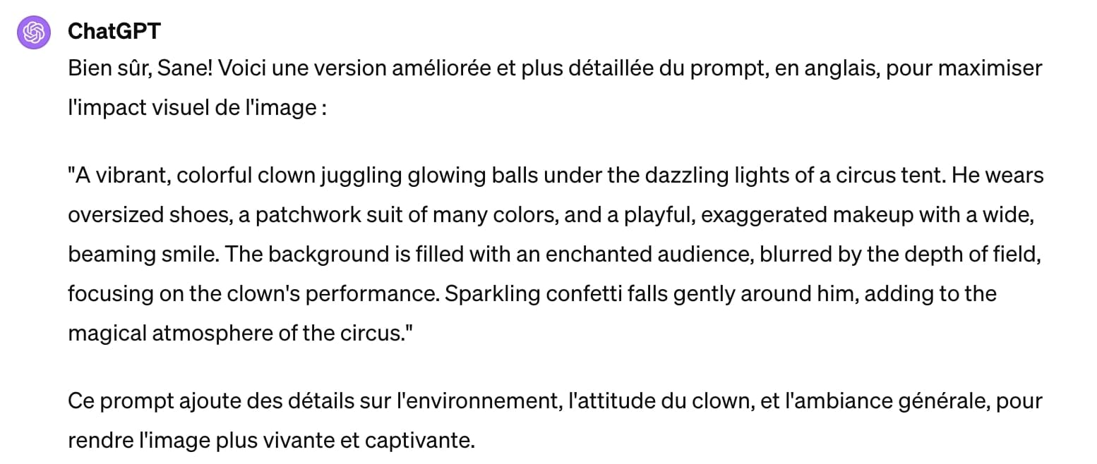 Il vous suffit de demander à ChatGPT d'améliorer votre prompt de départ, sans générer le visuel. Il vous fournira alors une version largement améliorée.