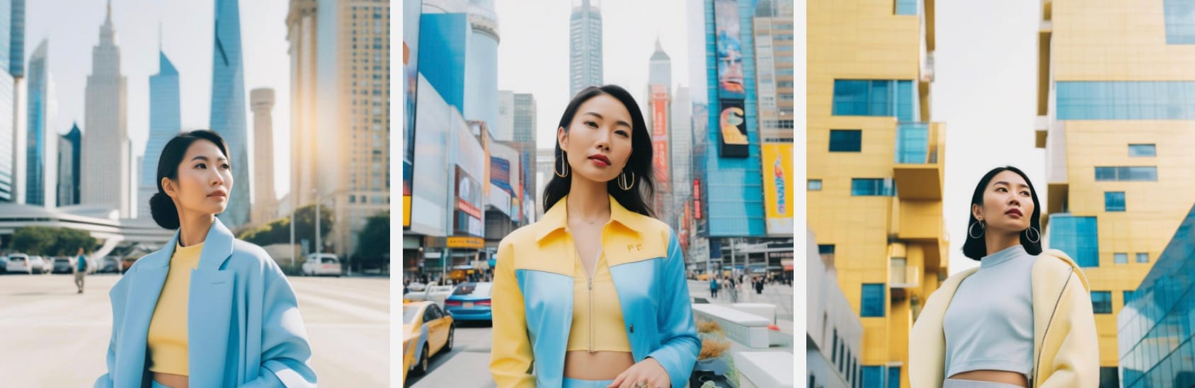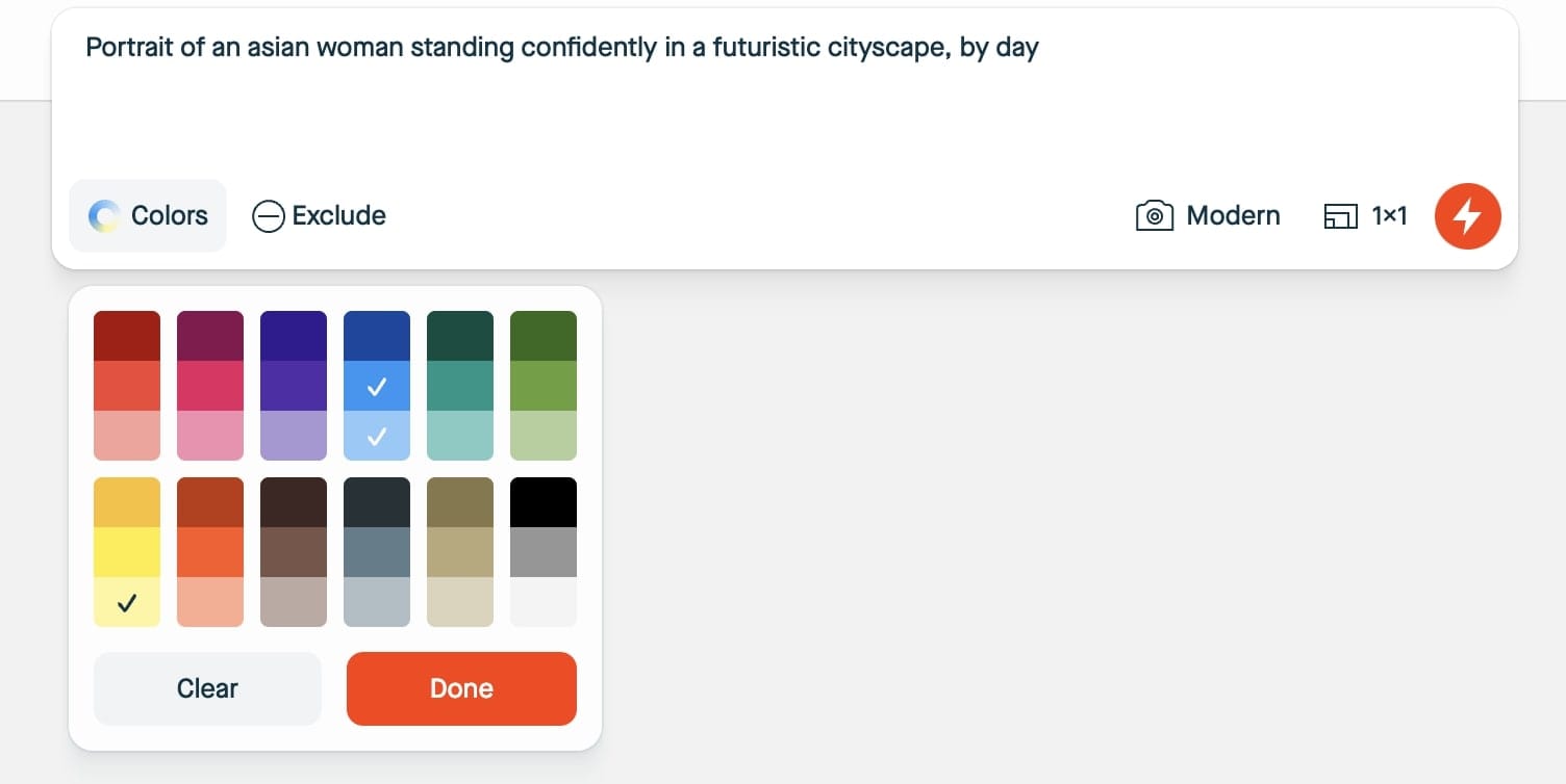 J'entre un prompt pour représenter une femme asiatique dans un environnement urbain plutôt futuriste, je sélectionne le style "modern photography", et surtout, je coche (dans la palette) les couleurs bleu et jaune.