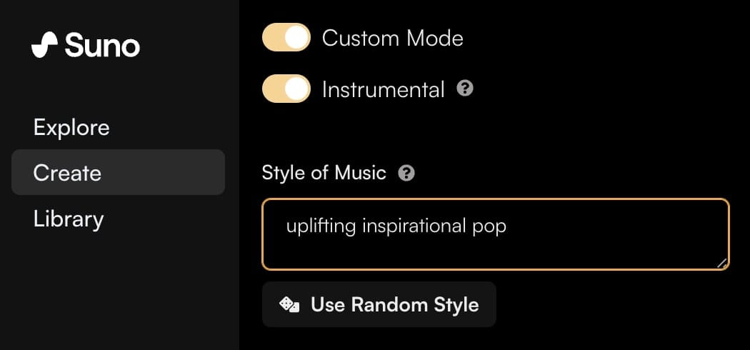 Une fois sur la page "Create" sur le site de Suno, enclenchez le "Custom Mode". Puis, activez l'option "Instrumental". Il ne vous reste plus qu'à décrire le style de la musique souhaitée.