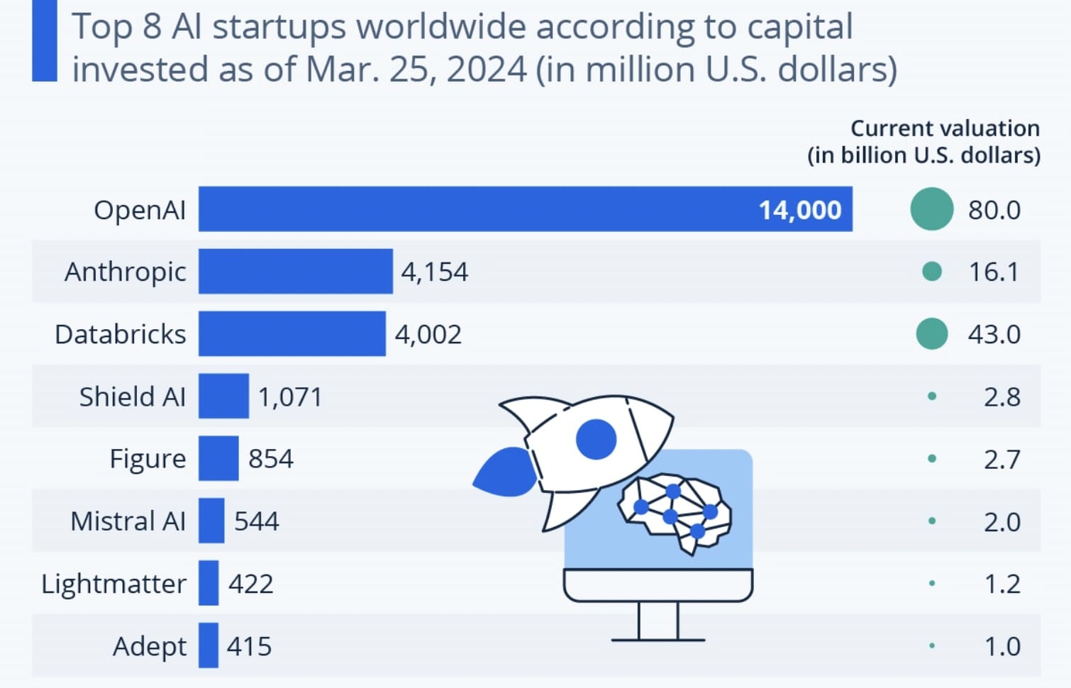 🤑 All-in sur OpenAI. C'est en effet le développeur IA qui a réuni le plus de fonds sur son nom, essentiellement de la part de Microsoft.