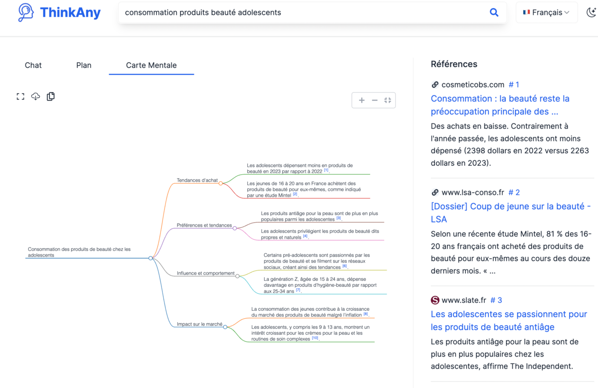 Vous pouvez visualiser les réponses de ThinkAny sous la forme d'une réponse rédigée, mais aussi sous la forme de bullet points ou enfin sous la forme d'une carte mentale (mindmap).