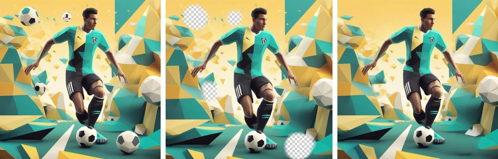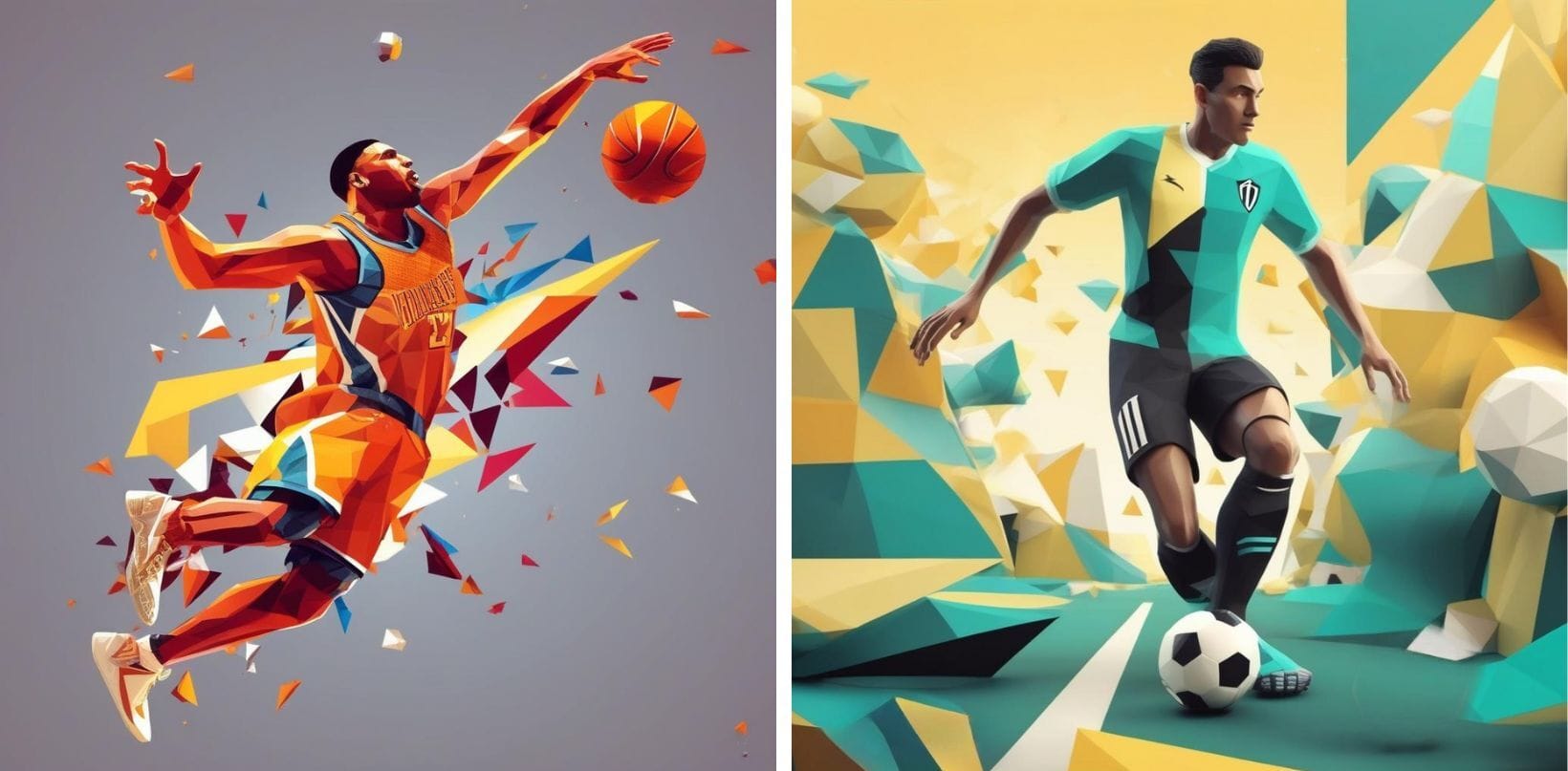 Illustration of a [sport] player in action [main action], surrounded by a few dynamic geometric shapes. The background features a vibrant and energetic design, with elements like sharp lines and geometric patterns to emphasize speed and motion. The character stands out. ad poster.Pour le joueur de foot, les crochets seront ainsi remplacés par "football player in action shooting the ball", et côté basket : "basketball player in action mid-dunk". Pour ce résultat :
