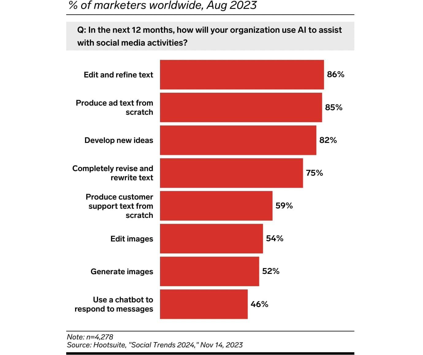 Plébiscite. Les marketeurs utilisent l'IA pour de nombreux usages, en tête desquels l'amélioration d'un contenu existant et la rédaction de textes publicitaires. (source)