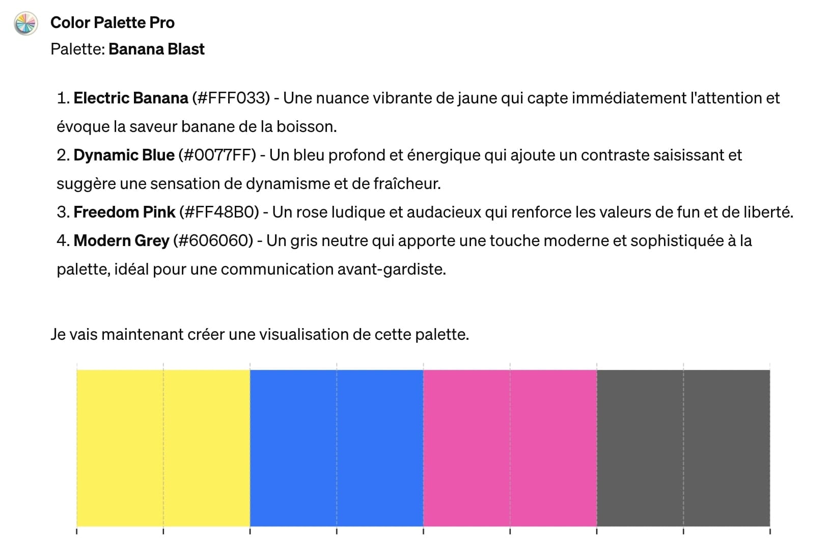 Le GPT s’exécutera en vous proposant une palette de 4 ou 5 couleurs. Rien de définitif : formulez-lui des feedbacks d’ordre général (« Les couleurs sont trop vives ») ou sur une couleur précise à remplacer (« Peux-tu remplacer la troisième couleur ? ») jusqu’à l’atteinte d’une palette satisfaisante.