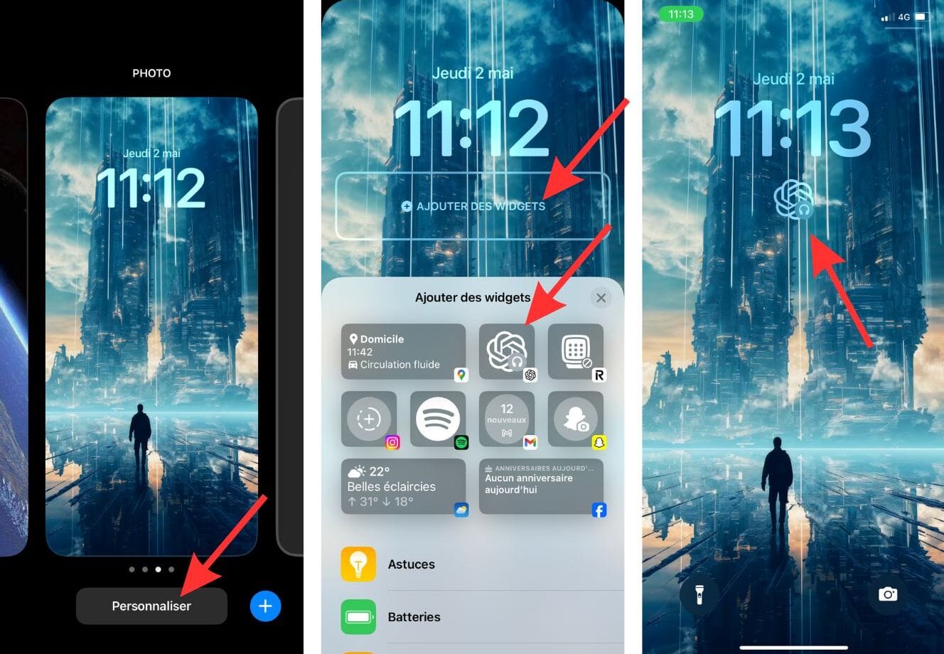 Depuis iOS 16, vous pouvez ajouter des widgets raccourcis directement sur votre écran verrouillé. Ainsi, plus besoin de déverrouiller votre iPhone pour ouvrir une app spécifique comme ChatGPT : un seul tap depuis l'écran verrouillé suffit.