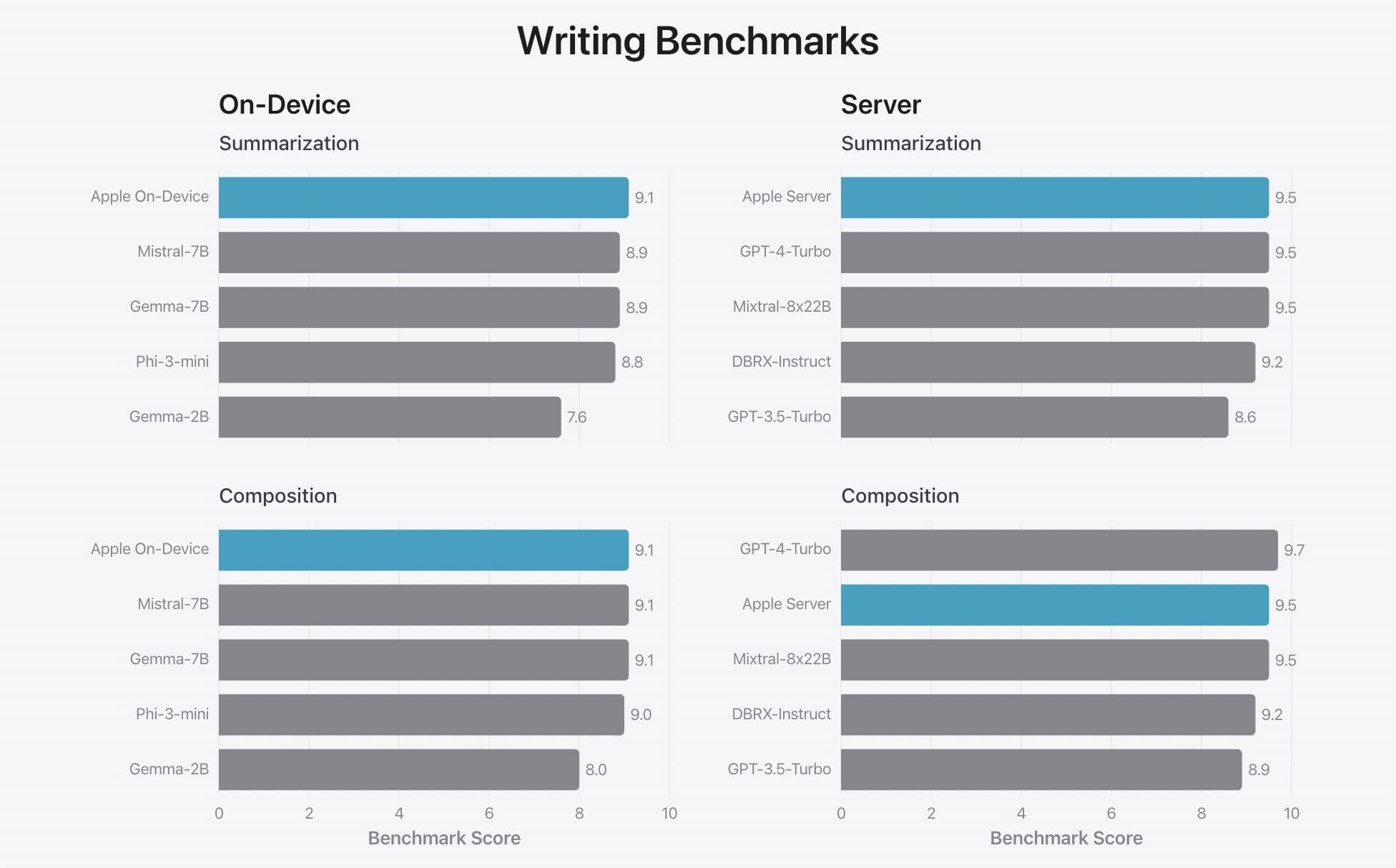 Mais les benchmarks réalisés par Apple montrent supposément une supériorité de leur modèle, qu'il soit exécuté en local sur le téléphone ou sur le cloud, sur deux fonctionnalités phare de l'IA générative : la rédaction et la synthèse de texte.