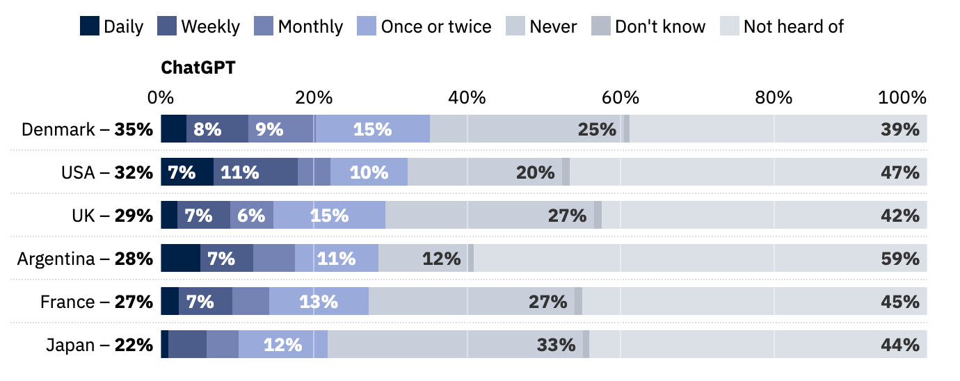 📊 Si vous utilisez ChatGPT régulièrement, sachez que vous êtes véritables pionniers de l'IA : seuls 9% des Français l'utilisent chaque semaine (dont 2% chaque jour). C'est ce que révèle une vaste enquête de Reuters sur 6 pays dont la France.