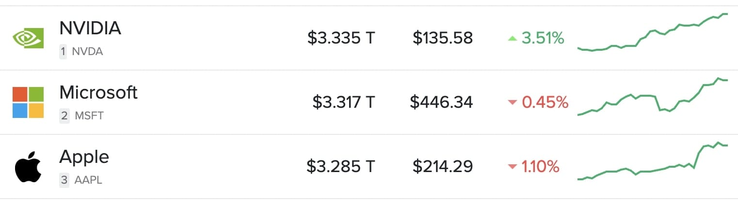 🥇Nvidia sur le toit du monde. L'entreprise se hisse à la 1ère place des capitalisations boursières mondiales, devant Microsoft.
