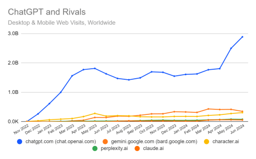 Le lancement du modèle 4o, qui a aussi marqué l'ouverture à tous des fonctionnalités d'upload, de génération d'images et d'usage des GPTs personnalisés, a permis une envolée du trafic en mai et juin.