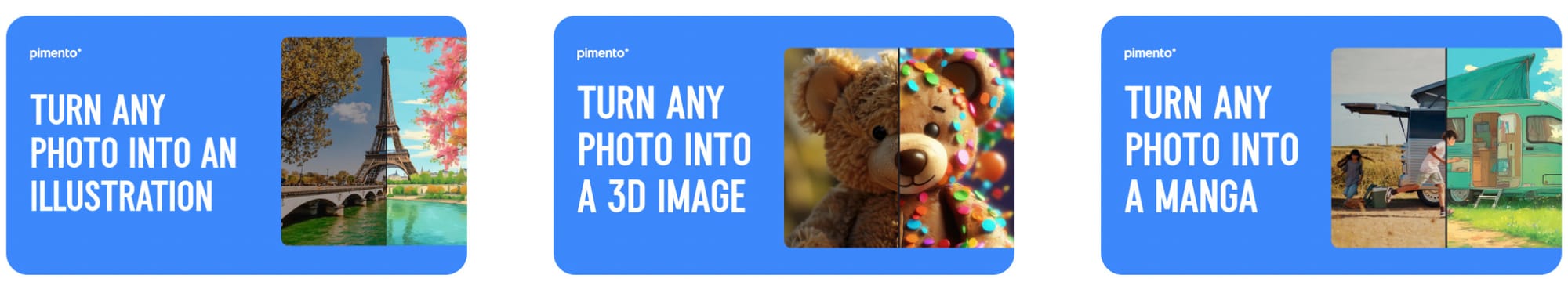 Il est ainsi possible de convertir n'importe quelle image de base dans un nouveau style. Cela pourrait être un des styles proposés par défaut par Pimento (illustration, design 3D, anime japonais, etc) mais aussi votre propre style de marque.