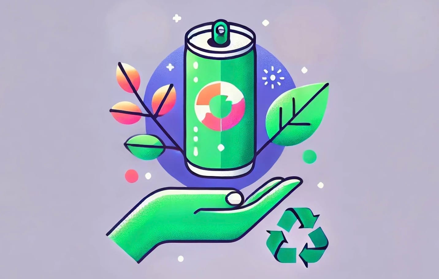 J'ai besoin d'illustrer un slide sur les engagements RSE de ma startup spécialisée dans [activité]. Sans générer de visuel pour l'instant, propose moi juste 5 prompts correspondant à des compositions originales, en t'assurant que cette dernière soit systématiquement minimaliste et colorée (prédominance de [couleurs]).Et voici le résultat après avoir sélectionné l'un des prompts soumis par ChatGPT (dans ce cas précis pour une activité dans les boissons, avec dominante violet + vert) :
