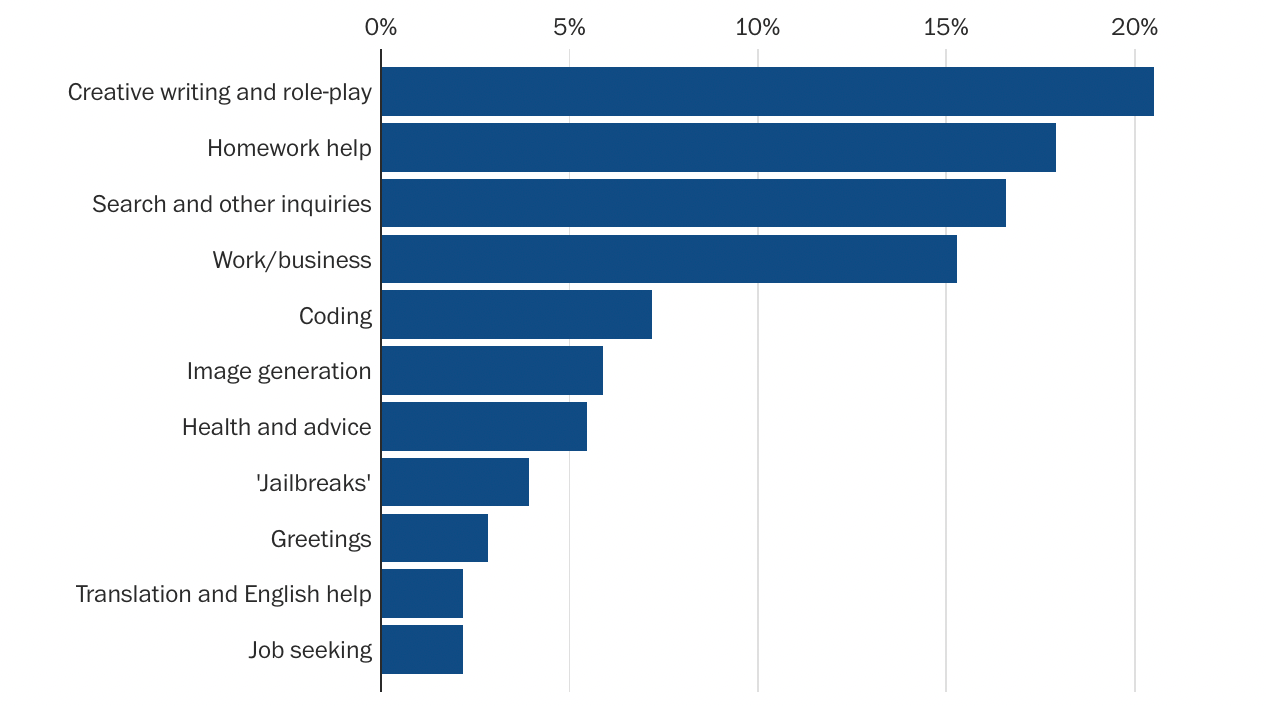 🤖 Conversations avec un robot. Le Washington Post a pu accéder à 40K conversations tenues avec WildChat, un chatbot IA gratuit, et a ainsi pu conduire une analyse détaillée sur ce que les utilisateurs demandent aux assistants IA : What do people really ask chatbots? It’s a lot of sex and homework.