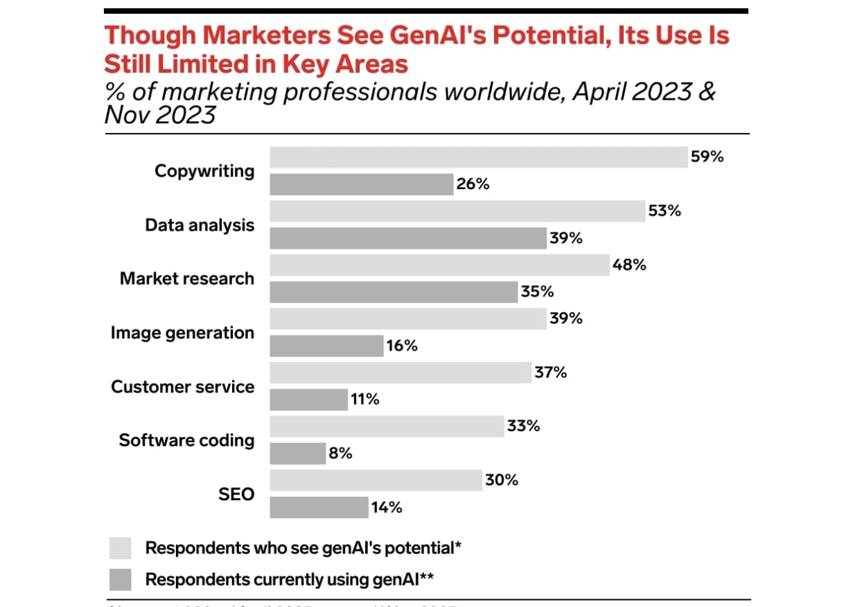 ▹ Usage marketing. eMarketer publie 5 graphiques sur l'usage de l'IA générative par les marketeurs. Le plus intéressant :