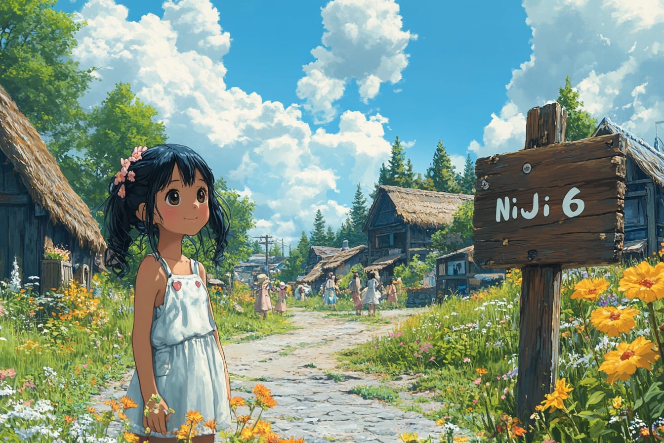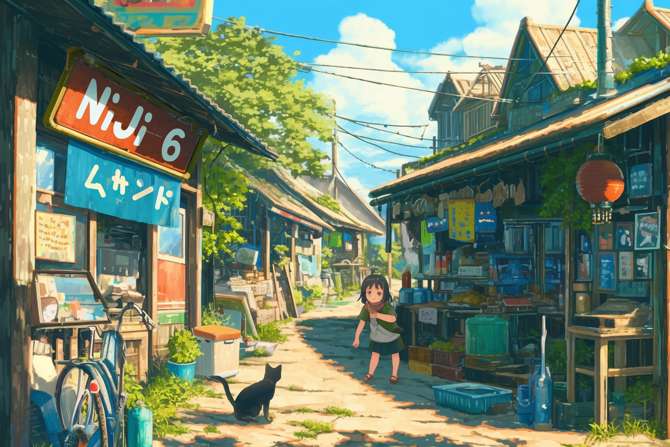 anime manga complex scenery with little girl in a country side village market with wooden sign written "NiJi 6", street life --ar 3:2 --s 1000 --p --niji