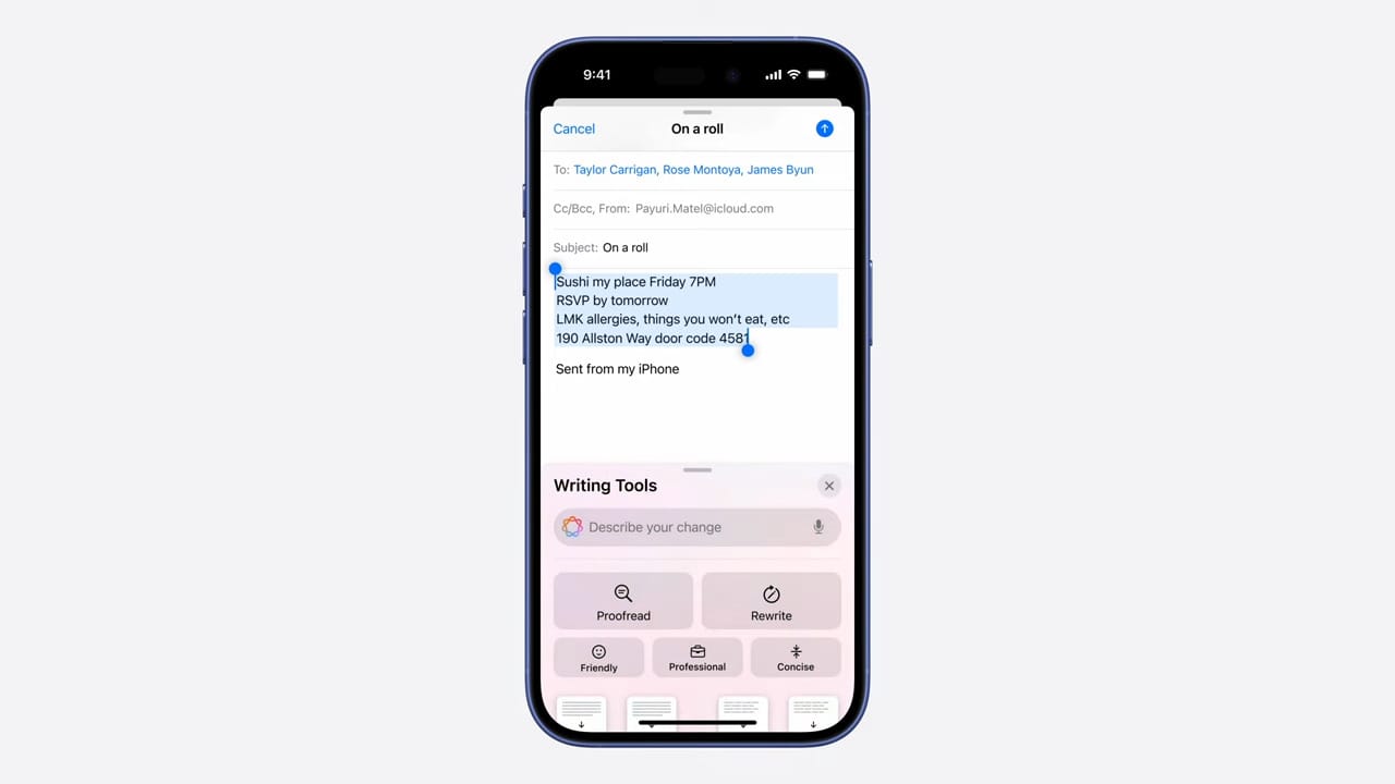- Writing Tool embarqué pour obtenir une relecture ou reformuler n'importe quel texte à tout moment (par exemple : "amical").