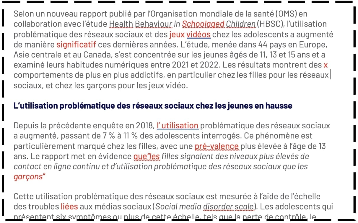 J'ai récupéré un article de presse, issu du Blog du Modérateur, sur la santé mentale des ados. J'y ai manuellement ajouté des fautes d'orthographe, d'accord, de ponctuation et de frappe. Très exactement 15 en tout. N'en jetez plus !
