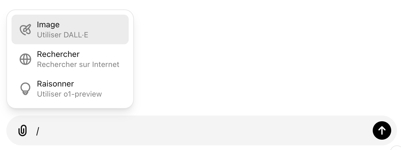 Il suffit ainsi de taper "/" dans la barre de prompt pour que s'affichent 3 choix sélectionnables :