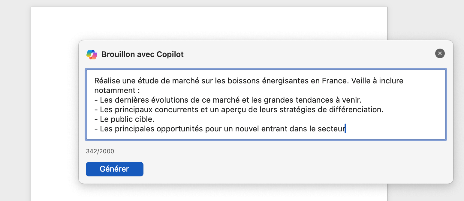 Un intérêt évident d'utiliser Copilot sur Office est la possibilité de générer du texte directement dans l'interface d'un traitement de texte, à savoir Word.