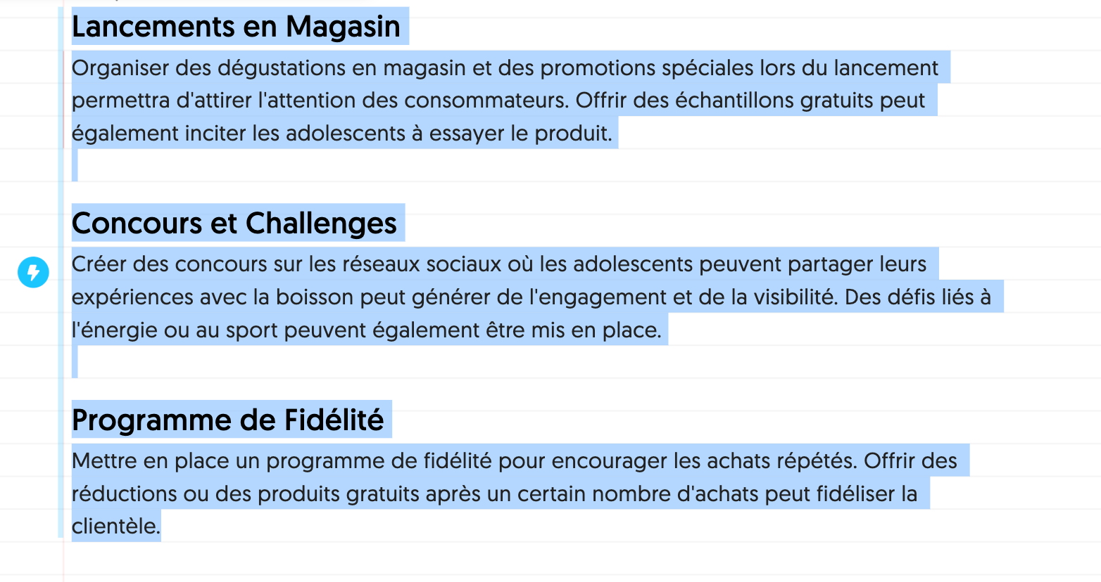 Voici un extrait d'un plan marketing généré sur Napkin (mais j'aurais aussi pu copié-collé un vrai plan de lancement). Je l'ai sélectionné et je peux désormais cliquer sur l'éclair bleu.