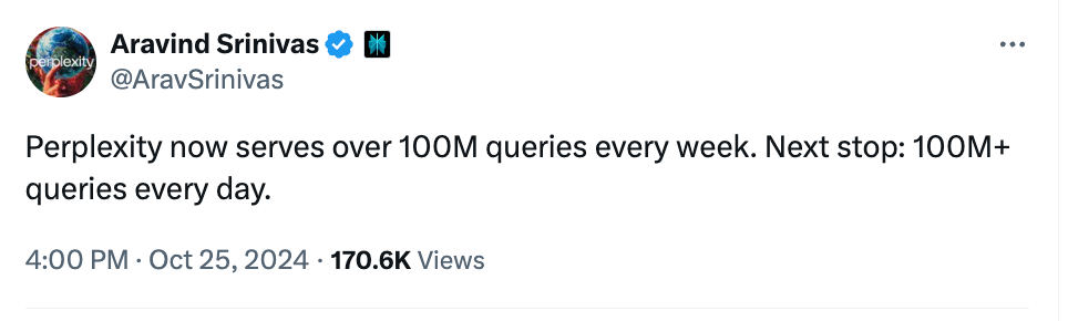 🔍 Recherche IA. Perplexity a franchi le cap des 100M de requêtes de recherche par semaine, ce qui représente une augmentation significative par rapport aux 250M mensuels observés en juillet dernier. Jolie traction.