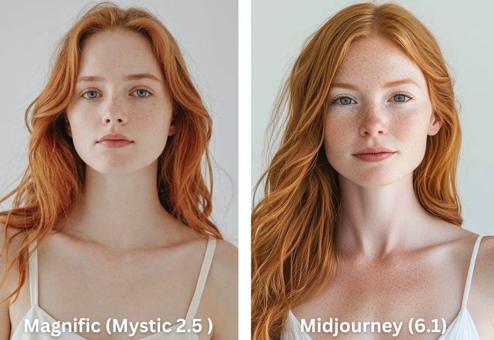 Comparons donc la performance de Magnific (avec le modèle Mystic 2.5) dans ce nouveau mode VS la référence Midjourney, avec deux portraits :