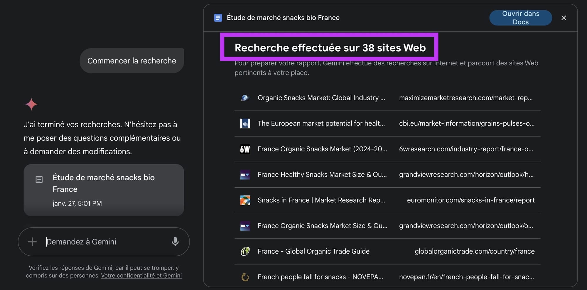 Lorsque je lance Gemini Deep Research sur la rédaction d'une étude de marché sur les snacks bio en France, ce sont pas moinqs de 38 sites web qui sont ainsi explorées par le bot avant de me répondre, soit 4 à 8 fois plus de sources que ce que propose Perplexity ou ChatGPT !