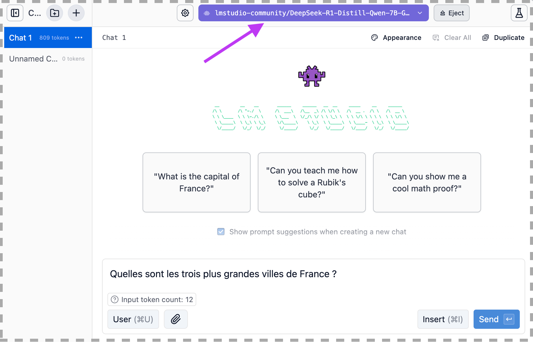 - Chargez le modèle via le menu déroulant dans l’interface de chat.