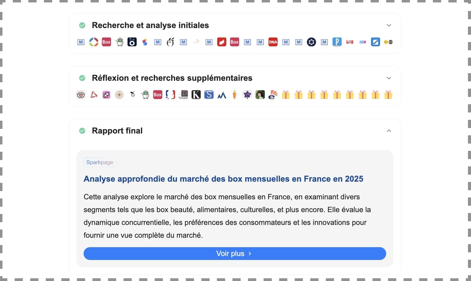 Ainsi, lorsque je le lance sur une étude de marché sur les box mensuelles en France, Genspark analyse pas moins de 572 sources 🤯. L'exécution prend entre 5 et 20 minutes.