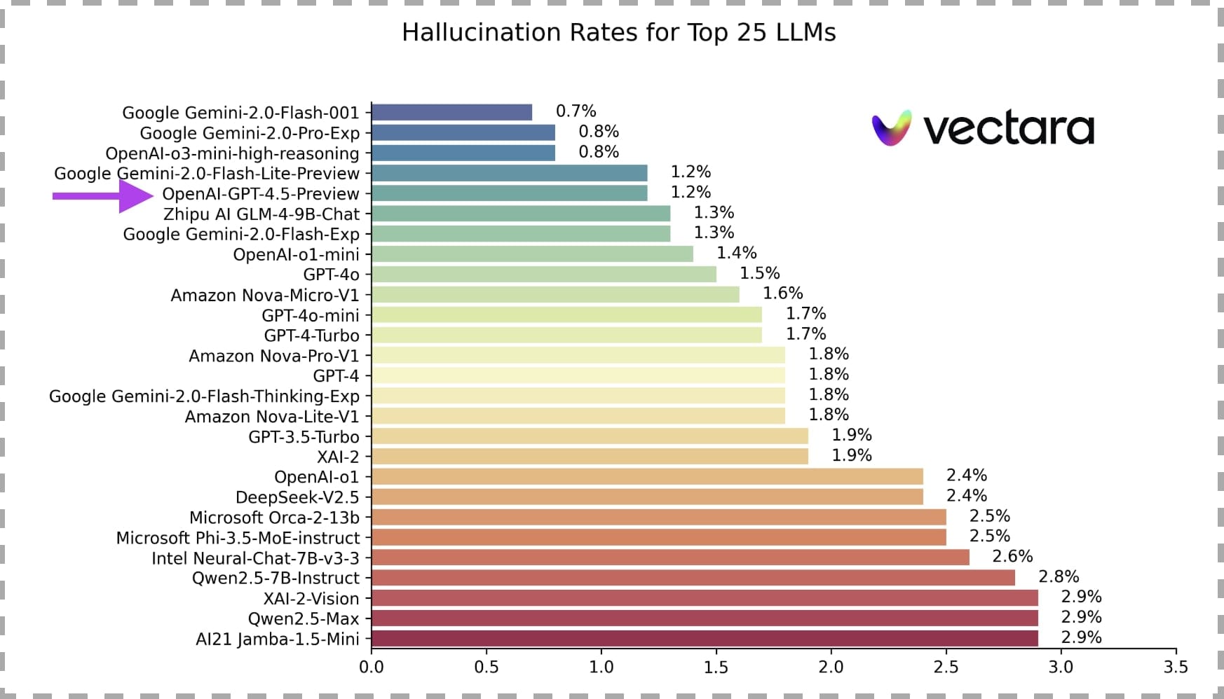 - Même si OpenAI promet une baisse des hallucinations, il est pour l'instant classé derrière les déclinaisons de Gemini 2 et derrière o3-mini sur ce front, comme en témoigne le benchmark de Vectara.
