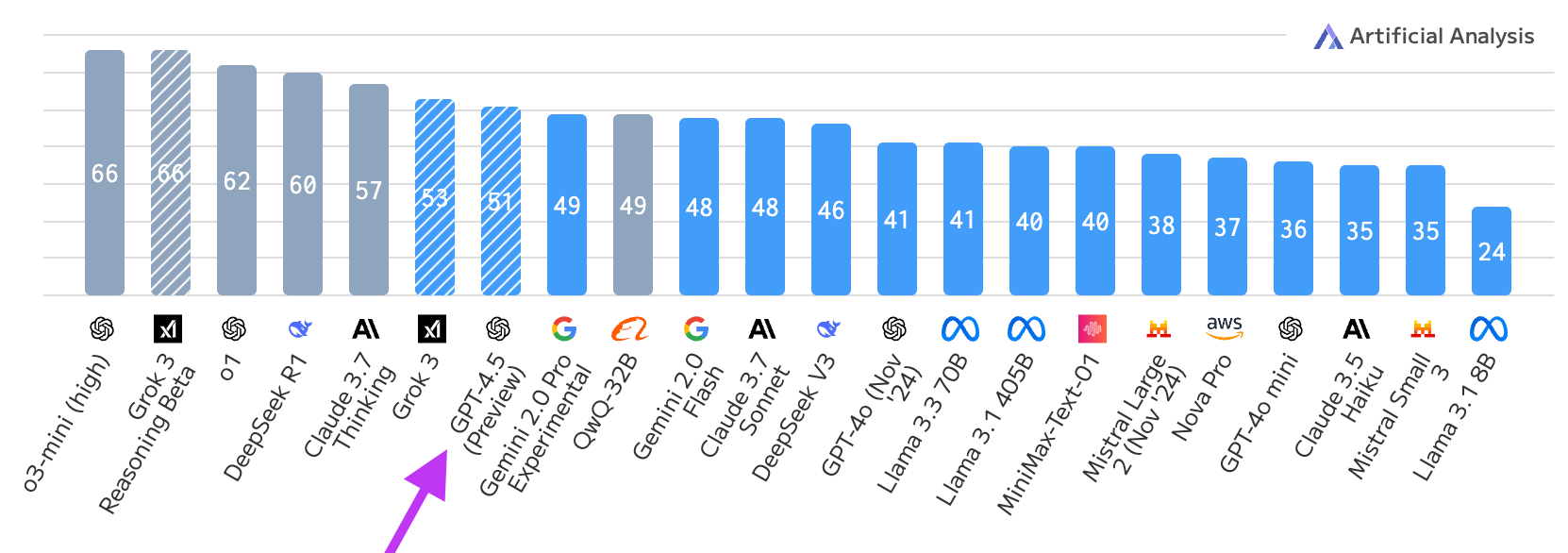 À l'exception d'un Grok 3 (que l'on préférera laisser au milliardaire taré et kétaminé qui le soutient), GPT-4.5 affiche donc une performance supérieure (score de 51), notamment par rapport à GPT-4o (score de 41).