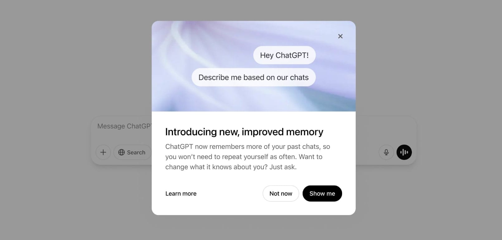 🧠 Plus de mémoire. ChatGPT ne pouvait jusqu'à présent se souvenir que de quelques bribes clés de vos précédentes conversations. Il peut désormais garder tout en mémoire, pour une personnalisation plus poussée que jamais.