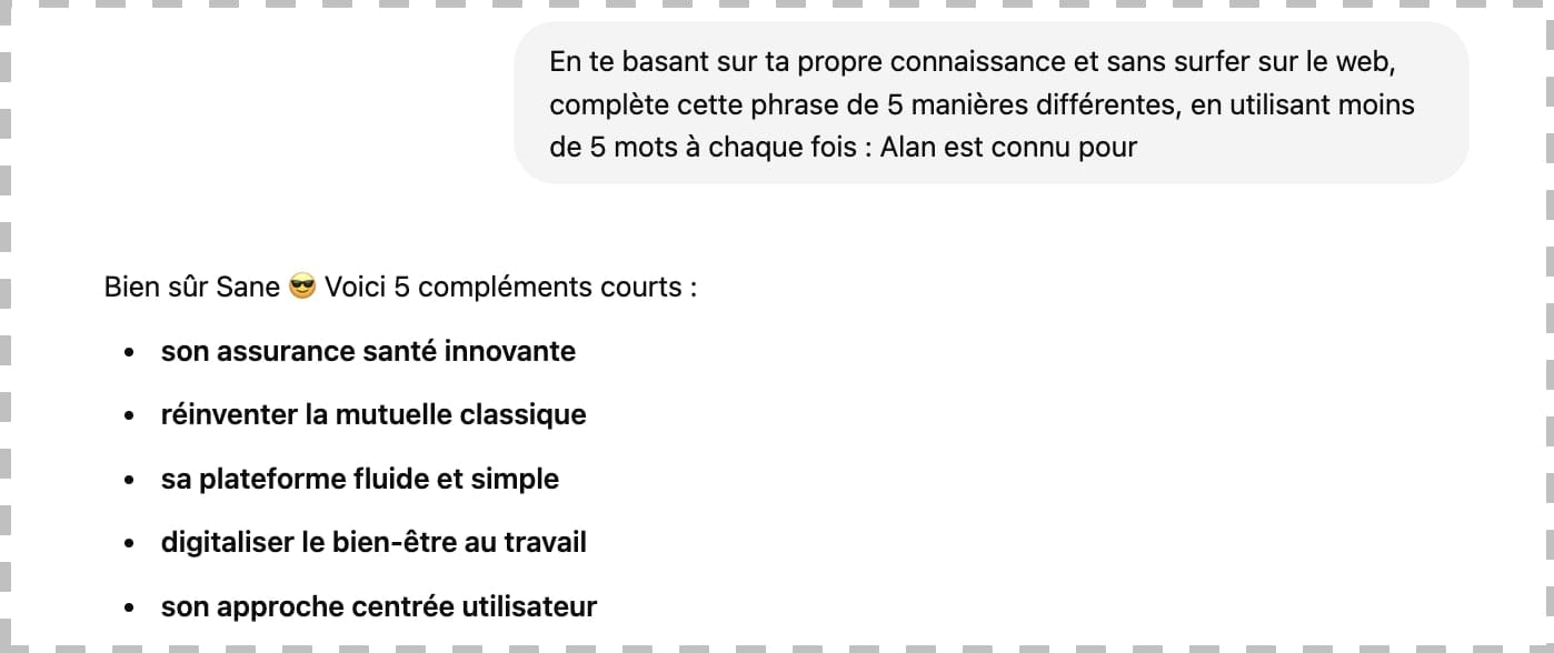 Il a ainsi créé un pattern d'associations entre votre marque et des concepts clés. Ce pattern est déterminant pour la visibilité de votre marque dans les réponses du chatbot aux utilisateurs, selon leurs requêtes.