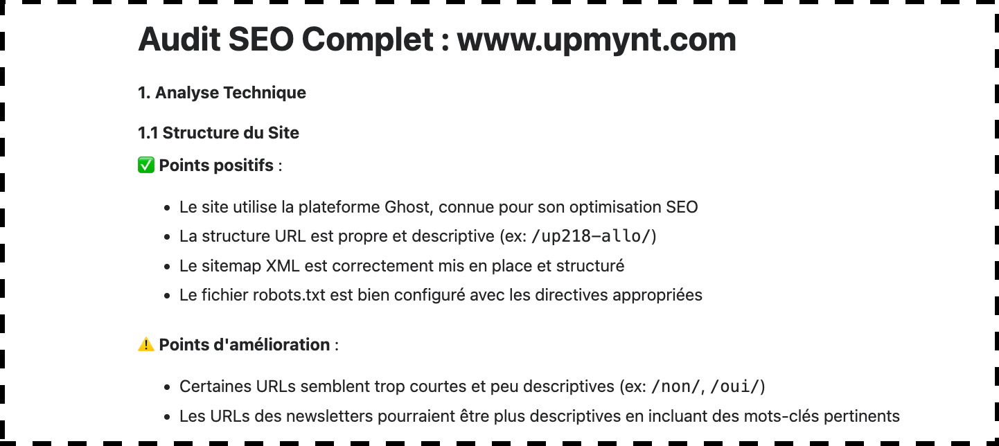 Lorsque je demande à Genspark de réaliser un audit SEO du site Upmynt, je m'attends à ce qu'il me fournisse une analyse précise des balises Hn, de la structure des URLs, des temps de chargement ou encore des backlinks manquants.