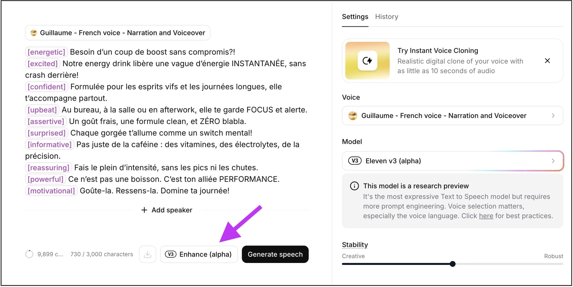 Avec le modèle Eleven v3, vous pouvez inclure des tags entre crochets dans le texte à générer afin de rendre le résultat encore plus naturel. Par exemple, [laughing] pour caler un rire, [whispers] pour faire chuchoter la voix, ou encore [swallow] pour marquer une pause (comme si le narrateur ravalait sa salive).