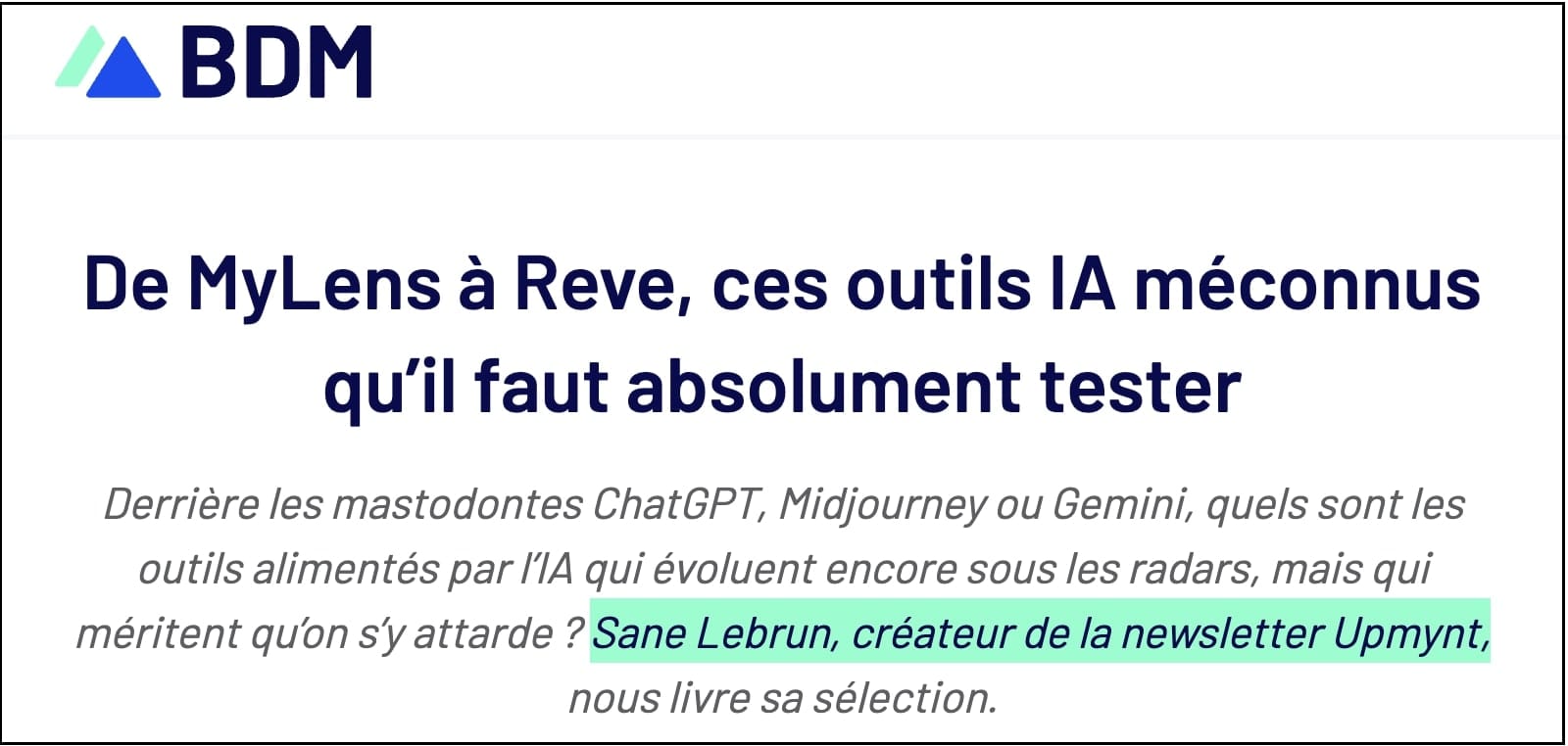 ▹ Précieux outils. 6 outils IA méconnus mais qu'il faut absolument tester, c'est la promesse de cette sélection publiée par Le BDM et réalisée… par mes soins :) Vous êtes donc entre de bonnes mains.
