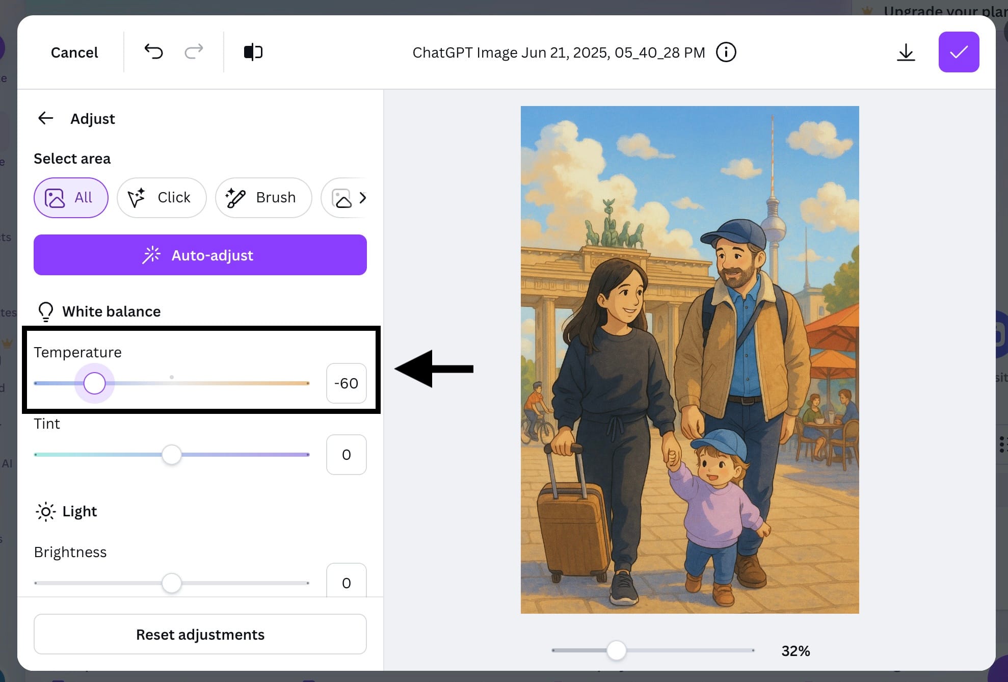 Sur Canva, un réglage -60 de la température permet de rétablir une teinte plus naturelle.