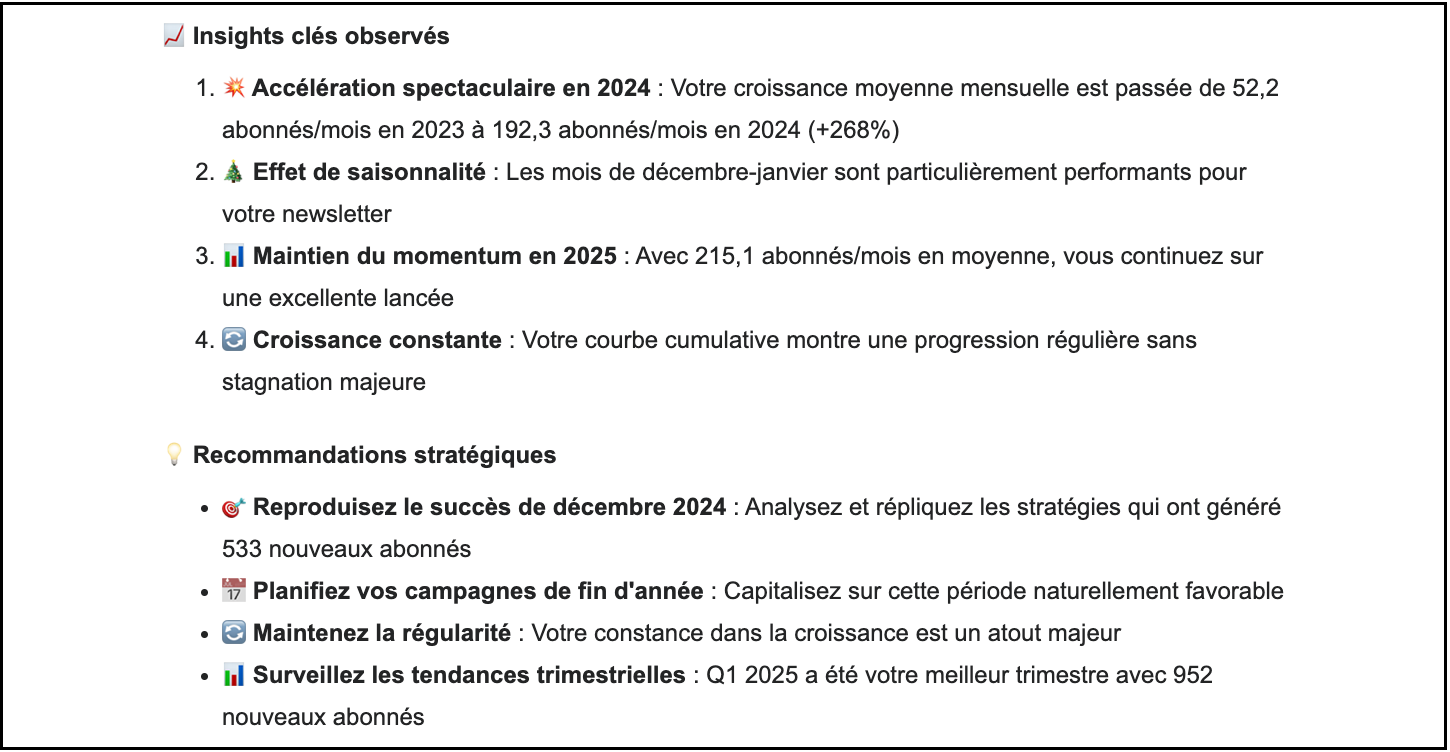 Pour ce comparatif, j'ai chargé les données liées à la croissance d'Upmynt et j'ai formulé ce prompt simple aux 3 outils :